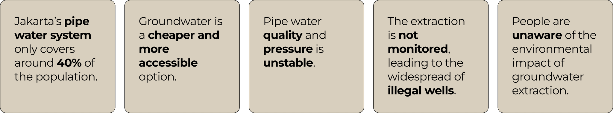 Jakarta’s pipe water system serves only 40% of the population, leaving most residents reliant on groundwater due to its affordability and accessibility. Poor regulation has allowed illegal wells to proliferate, further depleting aquifers. As groundwater levels drop, residents dig deeper, worsening land subsidence and creating a destructive cycle that threatens the city’s future.