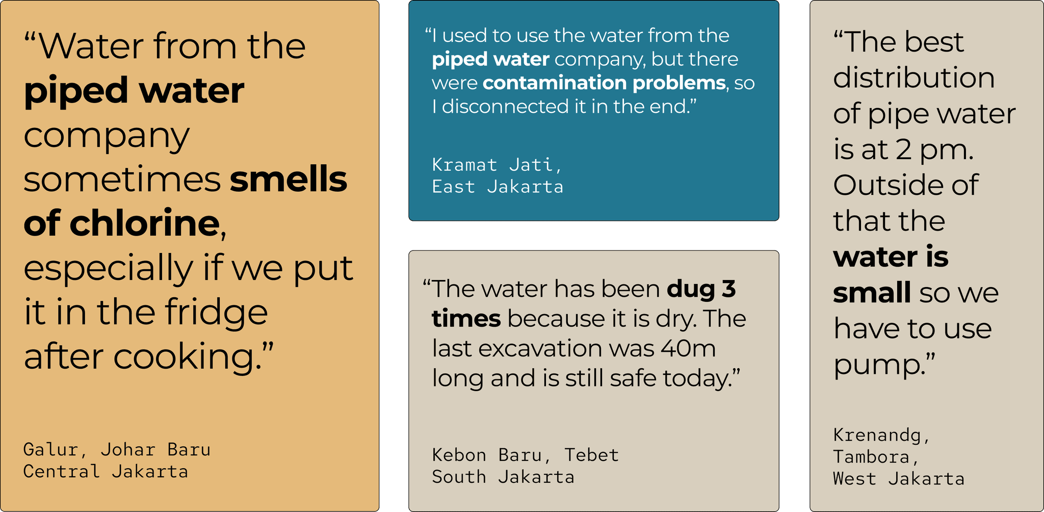This page visualizes household opinions on water, highlighting key themes such as water sources, groundwater quality, advantages, storage practices, and usage priorities. The design enables users to identify community needs and preferences quickly.
