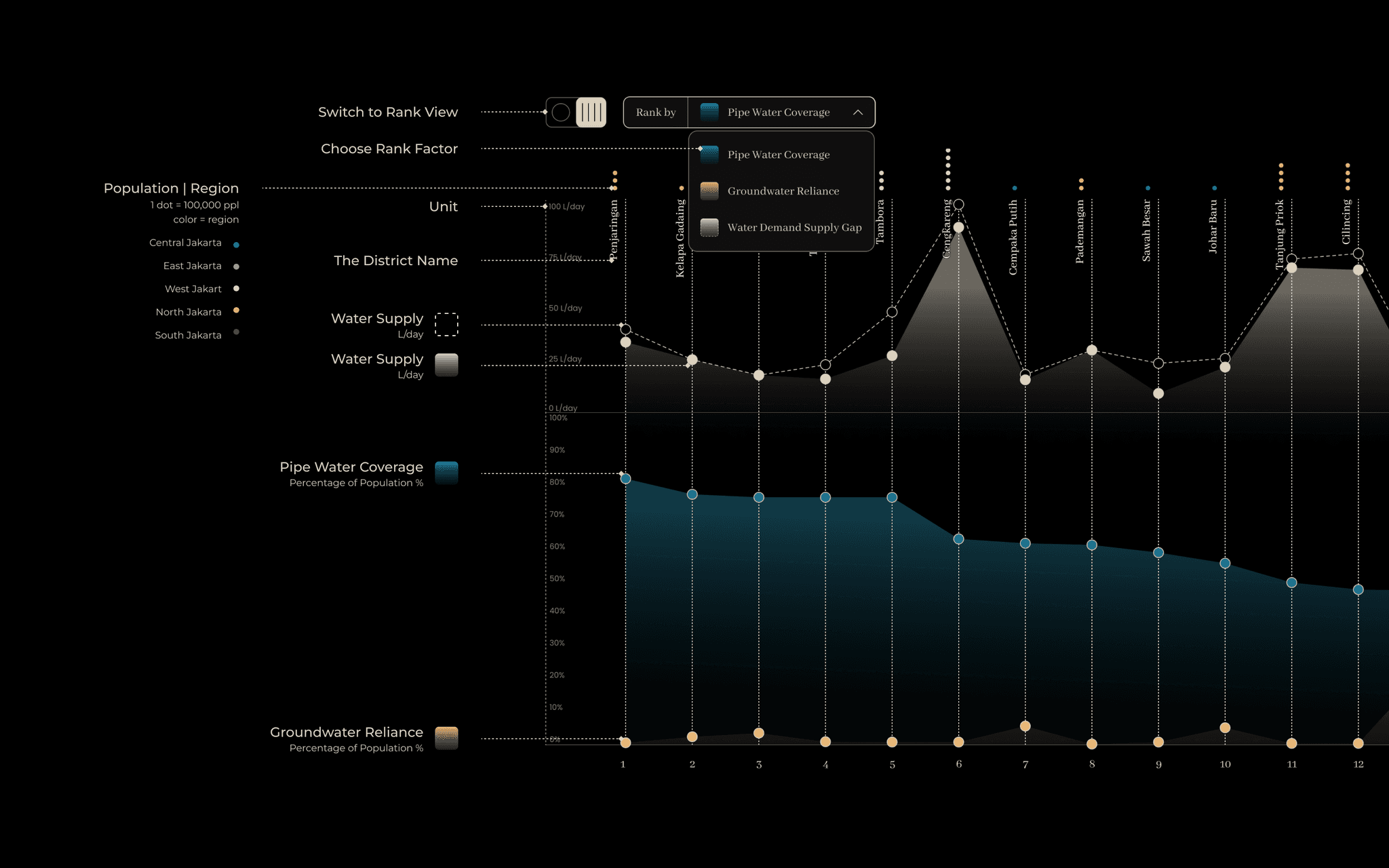 This data visualization project transforms complex water distribution and consumption data in DKI Jakarta into actionable insights. By analyzing patterns in supply, demand, pipe water coverage, and groundwater reliance at regional, district, and subdistrict levels, the dashboard empowers businesses, policymakers, and residents to make informed decisions for sustainable water resource management.