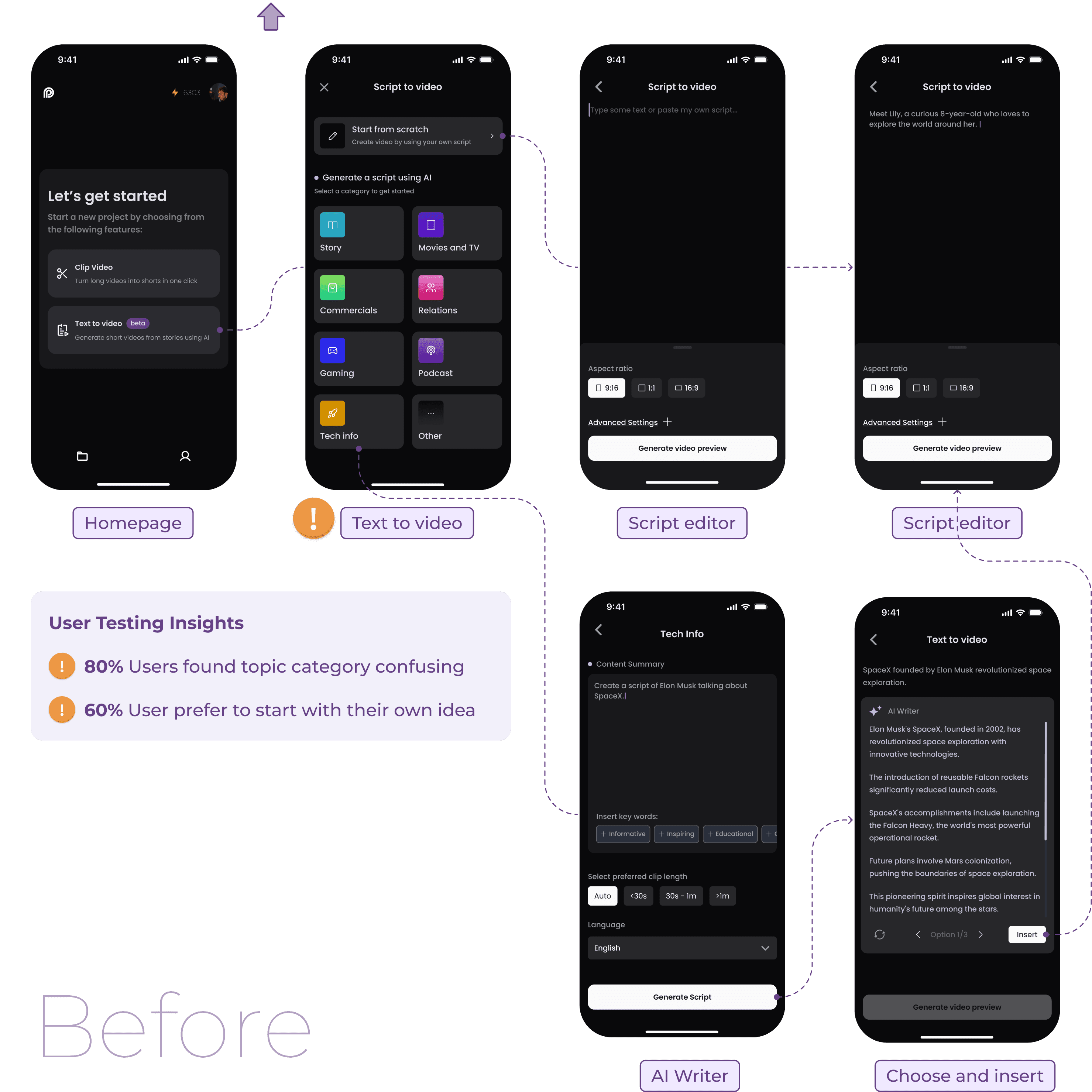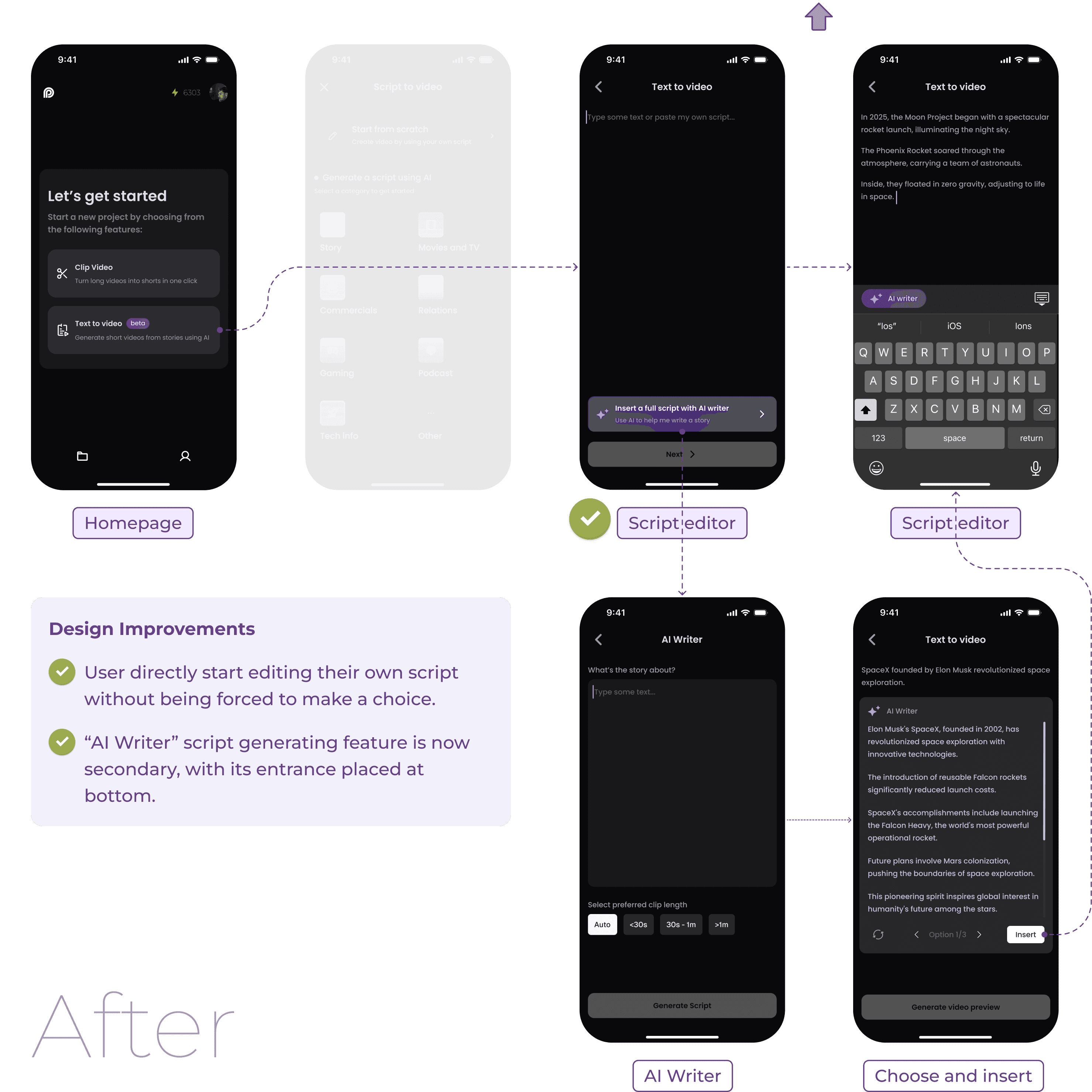 I designed the AI 'text-to-video' workflow, integrating AI functionality into script writing and storyboard editing for Opus Clip's upcoming mobile app.